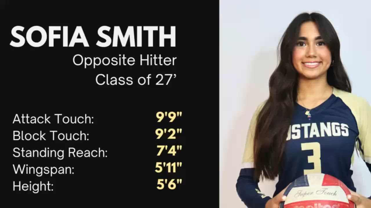 Hi! I'm Sofia Smith and this is my 3rd year as a varsity starter as a Junior OPP/OH. I play volleyball with an intensity and hunger, that is not very common to see in others. I push myself past my limits, and sometimes I even surprise myself with what I am capable of accomplishing. I am a disciplined athlete and I am constantly driving myself to be better because of how much I love this game. My goal is to play collegiate volleyball at the D1/D2 level. I know that I can achieve this, so I will.