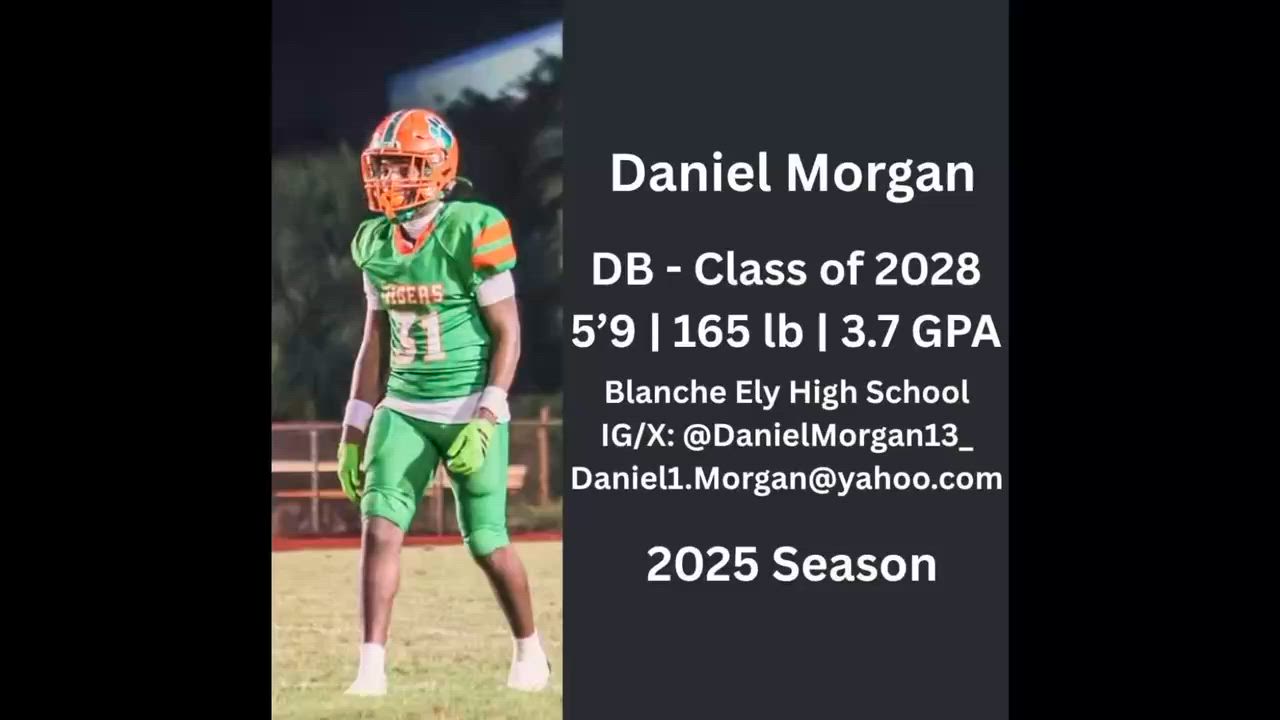 Daniel has been added to the Blanche Ely 2025 football roster.I am a 2028 CB from Miami, FL, now at Blanche Ely High School. At 5’9, 160 lbs (& growing), with a 4.41 40-yard dash, I bring speed, confidence, and consistency to the secondary. I am known for staying locked in coverage, stacking quality reps, and using my football IQ to anticipate and break on throws. I play with passion, compete every snap, and have the physical tools and mindset to contribute early at the collegiate level. Off the field, I am a high-achieving student with a 3.7 GPA.