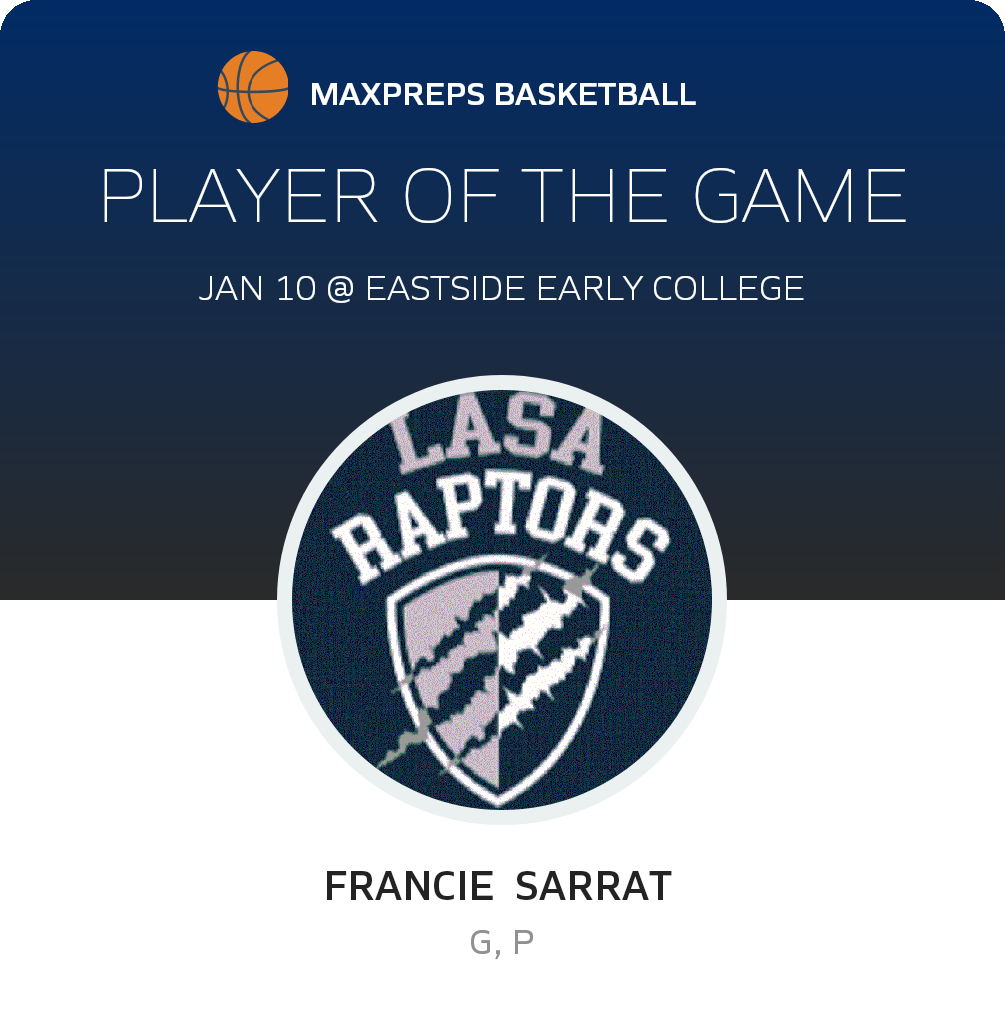 Congratulations to #13 Francie Sarrat for being selected the Liberal Arts & Science Academy - Austin Girls Basketball Player of the Game.