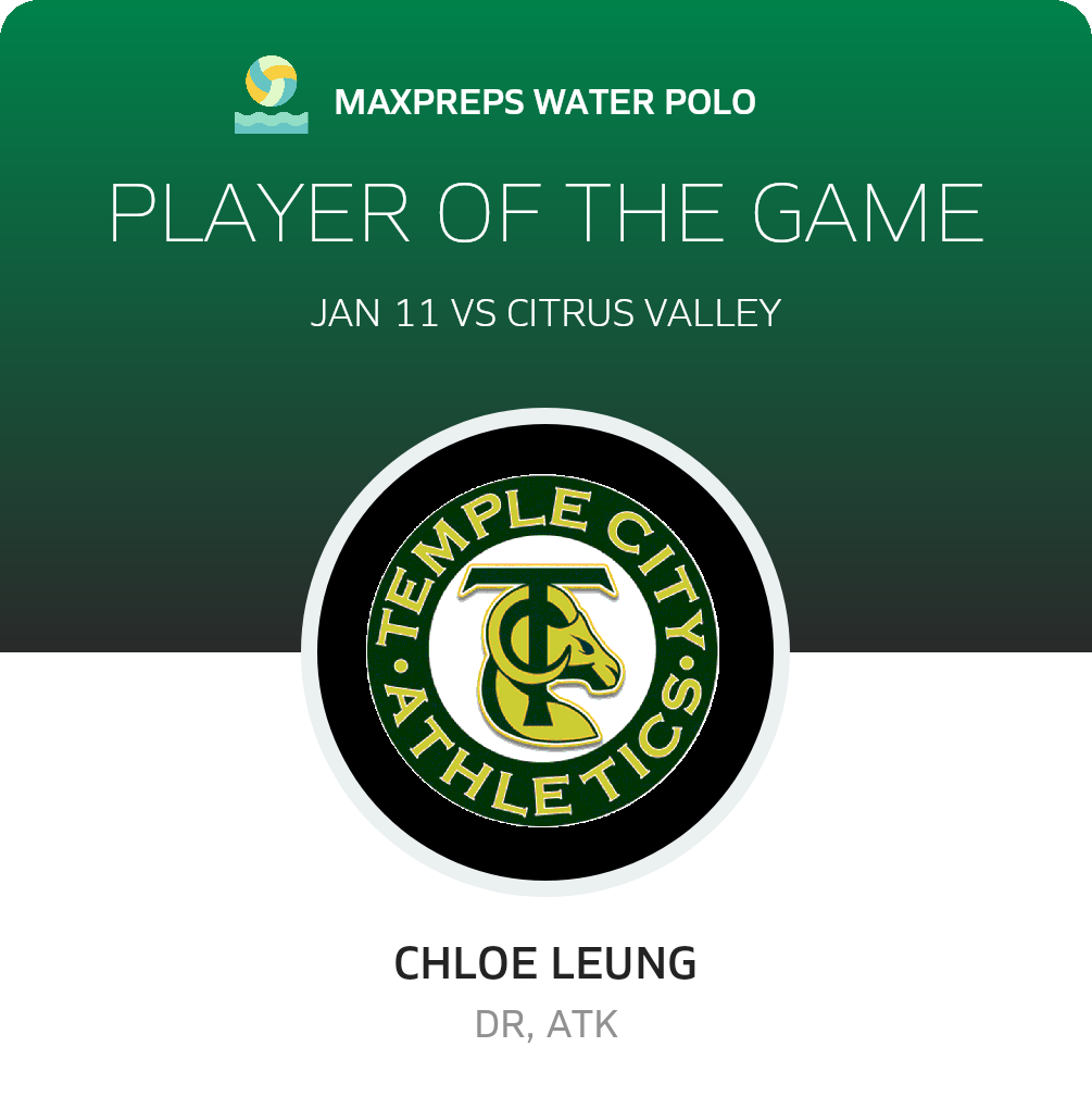 Congratulations to #8 Chloe Leung for being selected the Temple City Girls Water Polo Player of the Game.