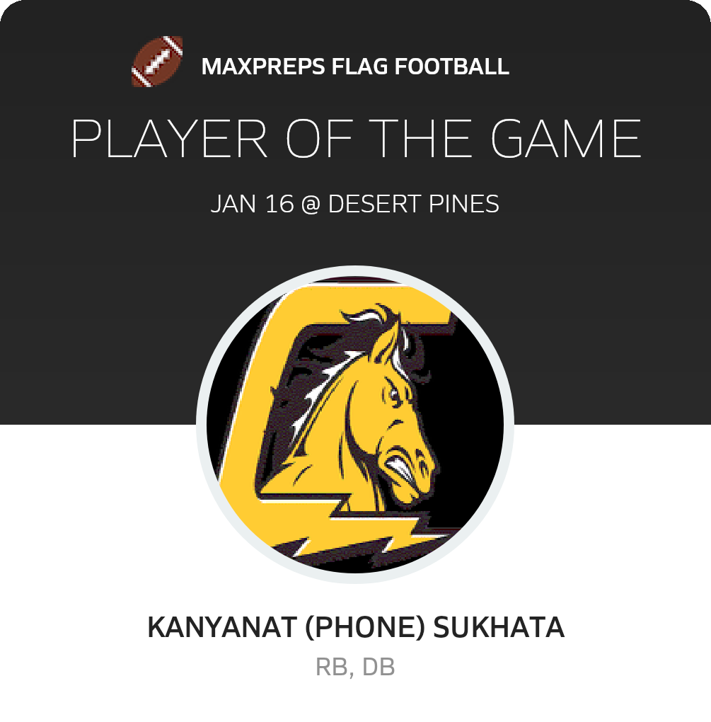 The Desert Pines (Las Vegas, NV) varsity flag football team lost Tuesday's home conference game against Clark (Las Vegas, NV) by a score of 22-6.