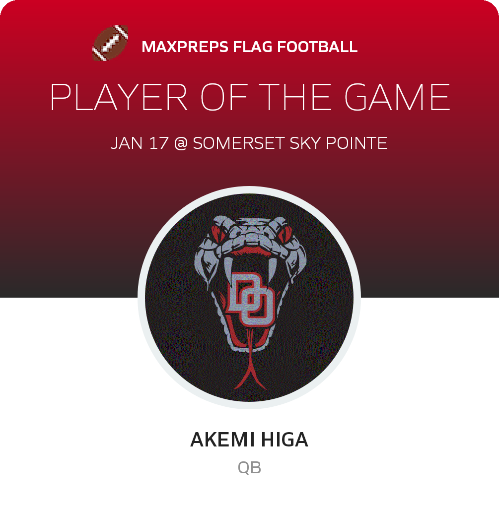 Congratulations to #5 Akemi Higa for being selected the Desert Oasis Girls Flag Football Player of the Game.