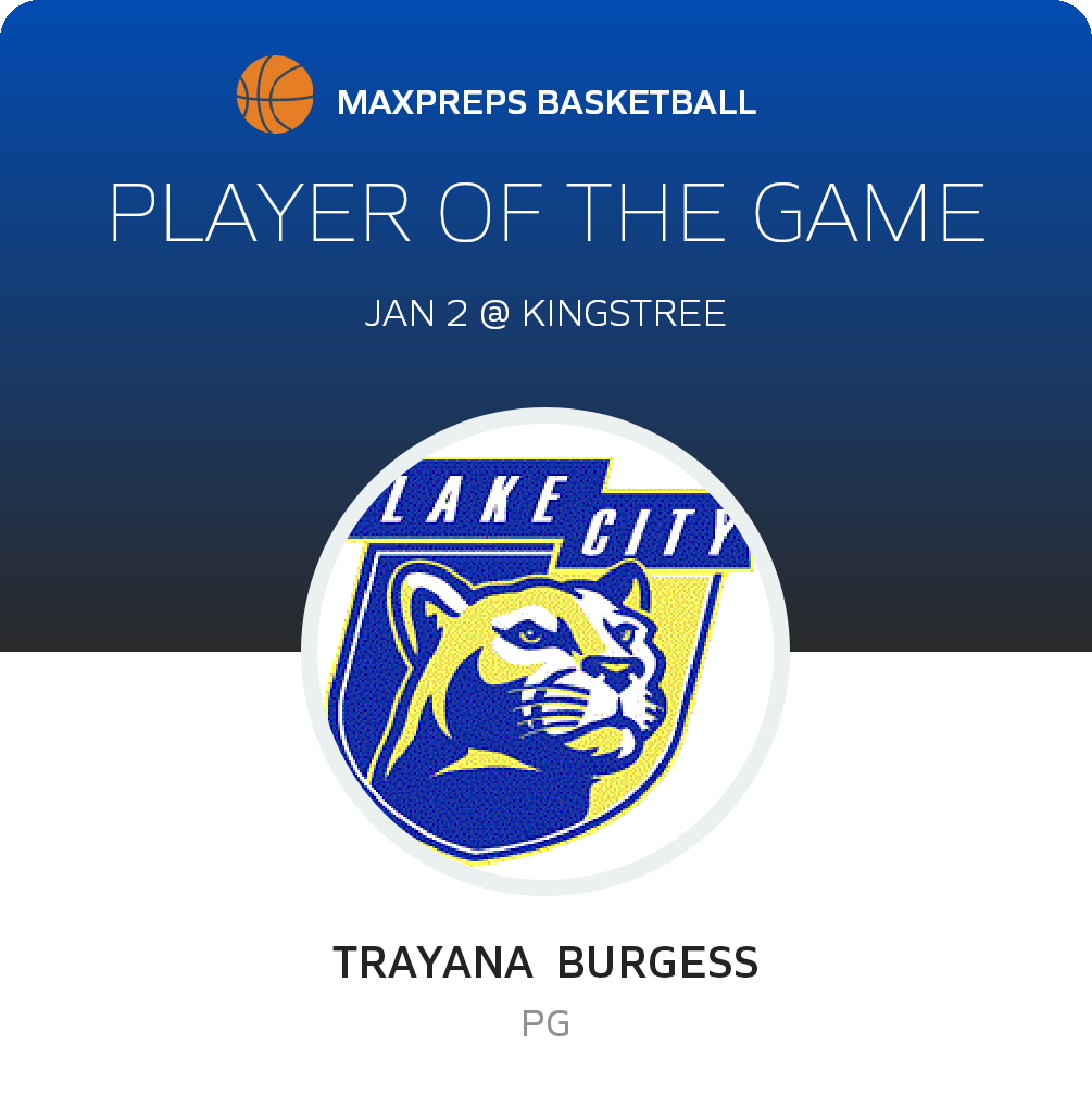 Congratulations to #1 TRAYANA BURGESS for being selected the Lake City Girls JV Basketball Player of the Game.