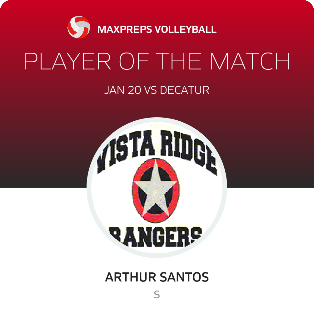 Congratulations to #10 Arthur Santos for being selected the Vista Ridge Boys Volleyball Player of the Match.