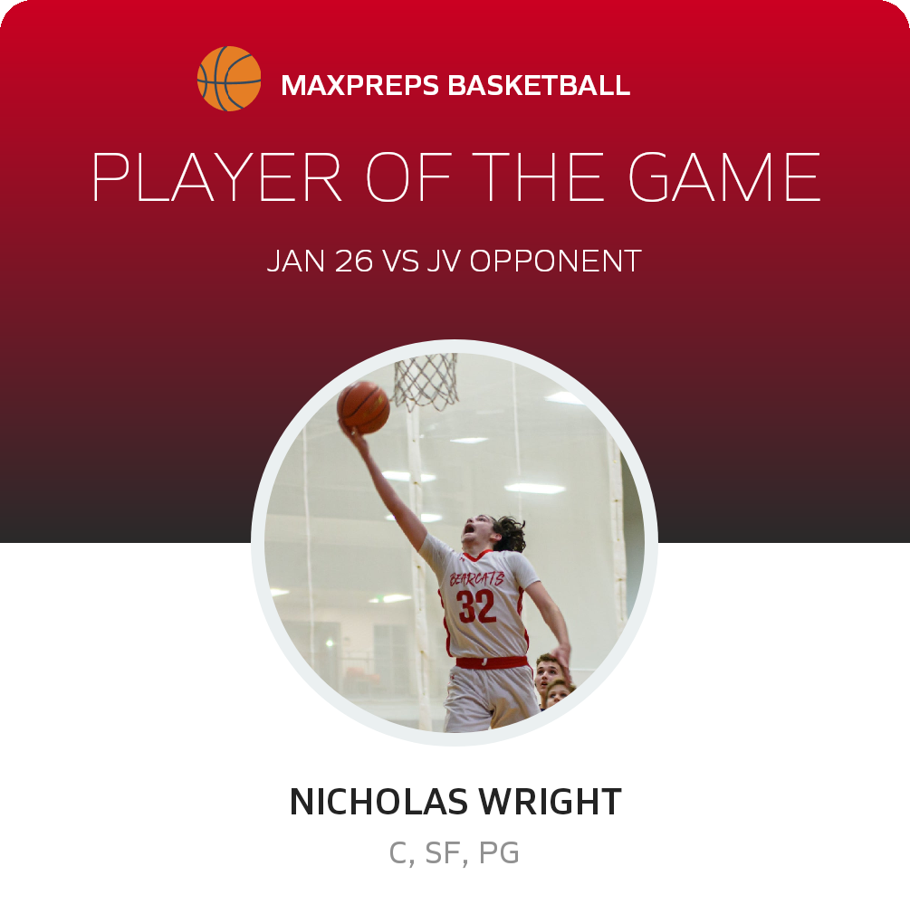 Congratulations to #32 Nicholas Wright for being selected the Upstate HomeSchool JV Basketball Player of the Game.