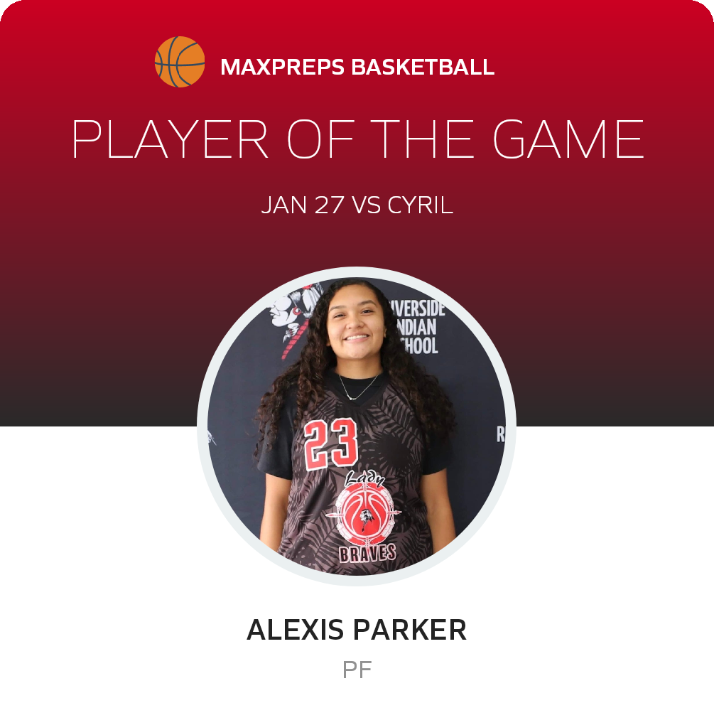 Congratulations to #23 Alexis Parker for being selected the Riverside Indian Girls Basketball Player of the Game.