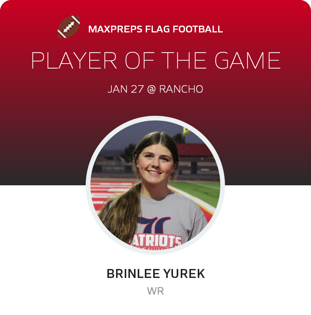 Congratulations to #21 Niajiah Deal for being selected the Rancho Girls Flag Football Player of the Game.