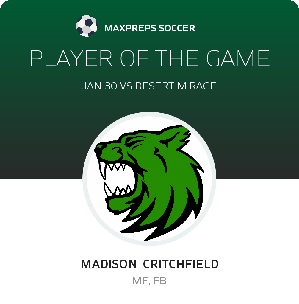 Congratulations to #2 Madison Critchfield for being selected the Twentynine Palms Girls JV Soccer Player of the Match.