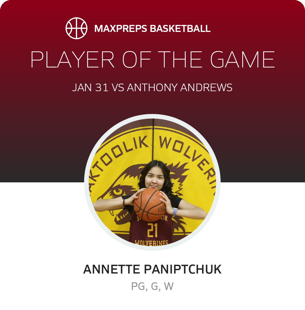 In their next game, the Storm battle the White Mountain Wolves (White Mountain, AK) in a 1A Bering Sea contest, on Saturday, February 1. Anthony Andrews will attempt to better on its 0-2 season record. The Wolves come into the contest with a 6-0 record after their 73-8 league win over Gambell (Gambell, AK).