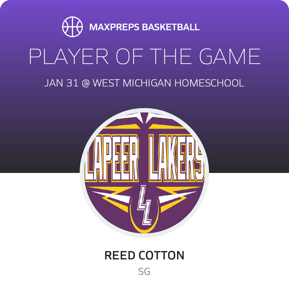 Congratulations to #12 Reed Cotton for being selected the Lapeer Lakers Homeschool JV Basketball Player of the Game.