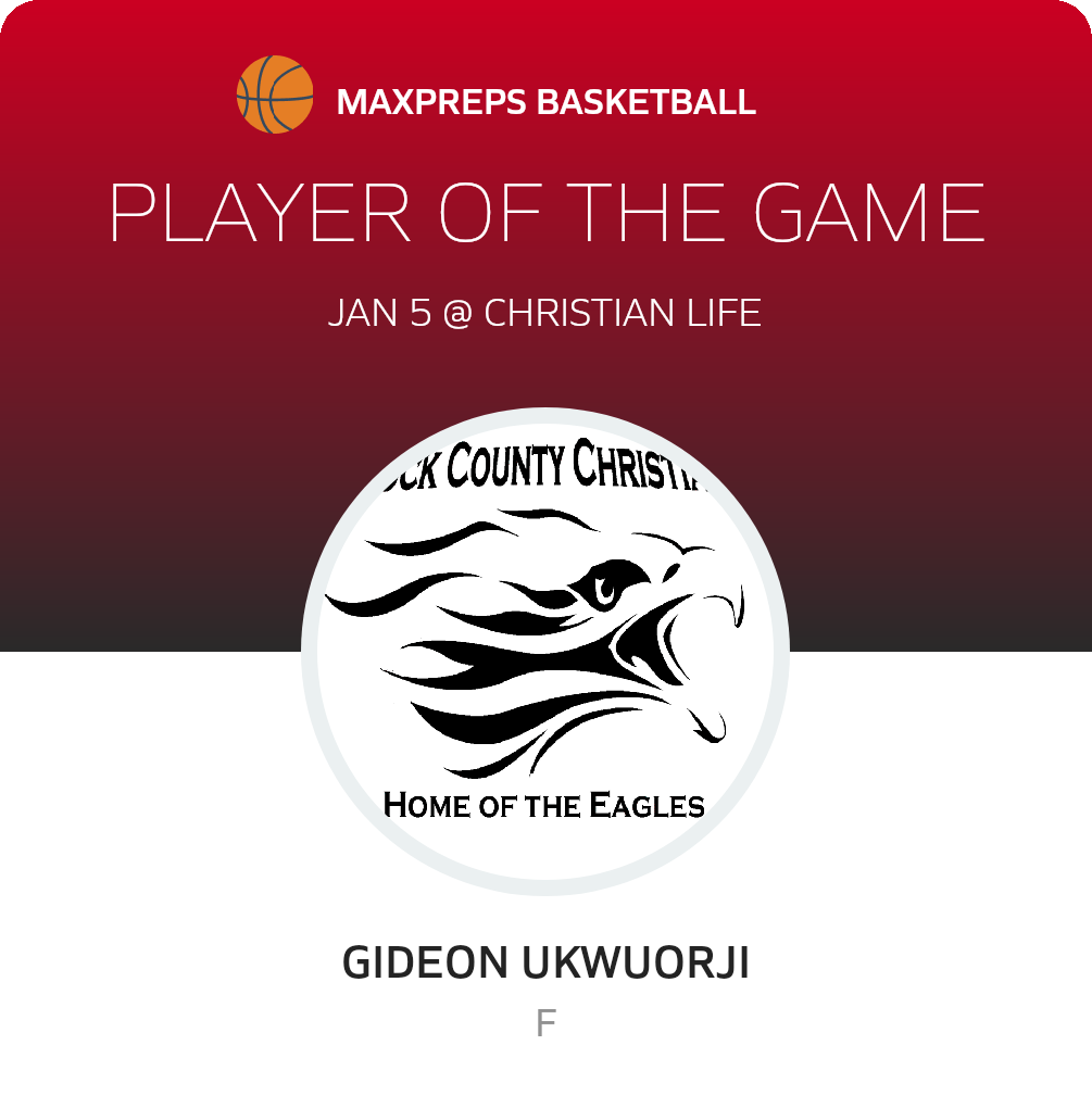 Congratulations to #14 Gideon Ukwuorji for being selected the Rock County Christian Basketball Player of the Game.