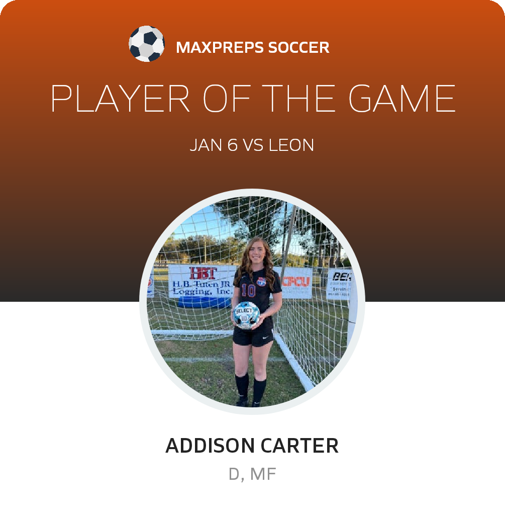 Congratulations to #12 Anne Osterhaus for being selected the Leon Girls Soccer Player of the Match.