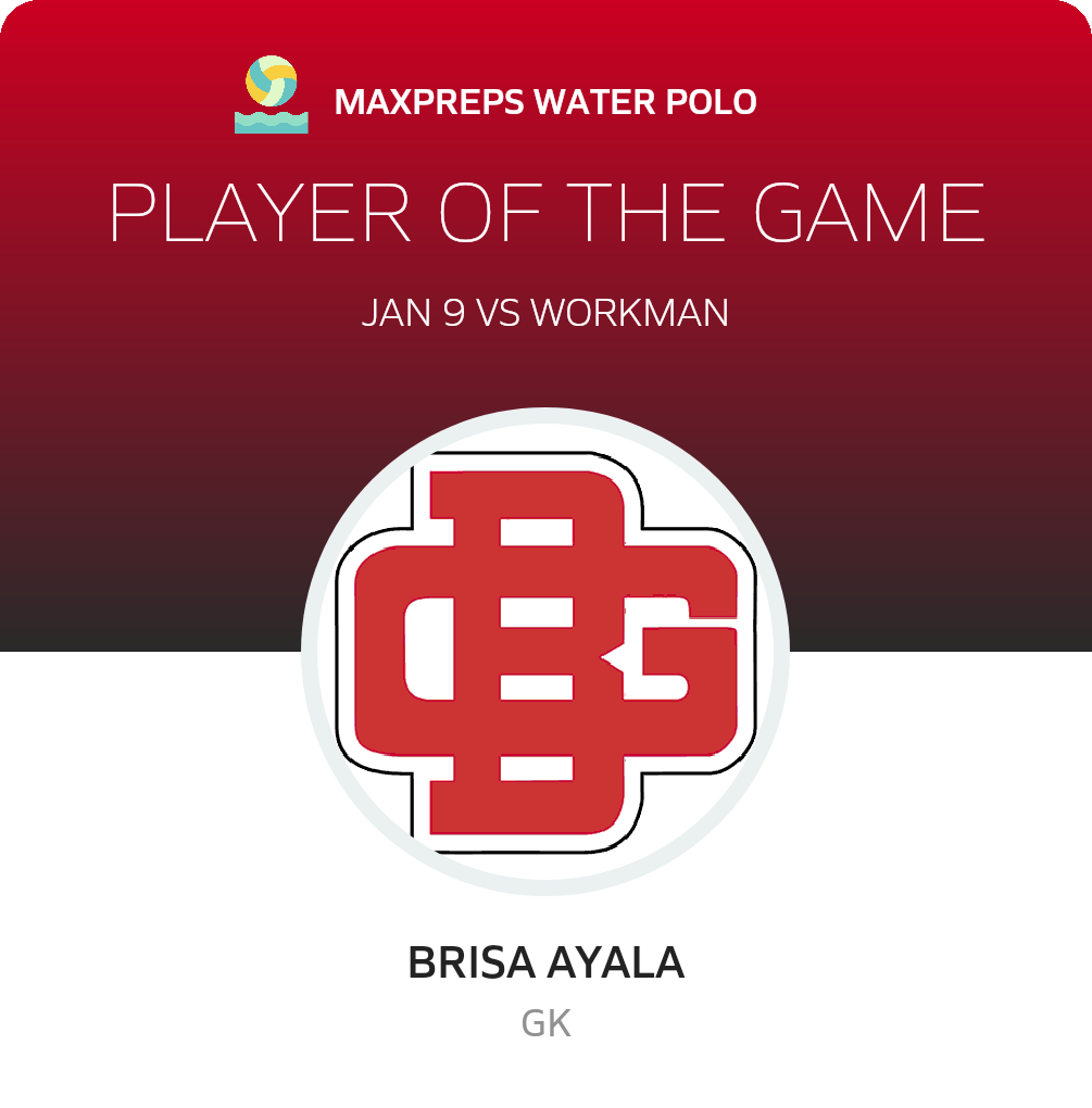 Congratulations to #1 Brisa Ayala for being selected the Bell Gardens Girls Water Polo Player of the Game.