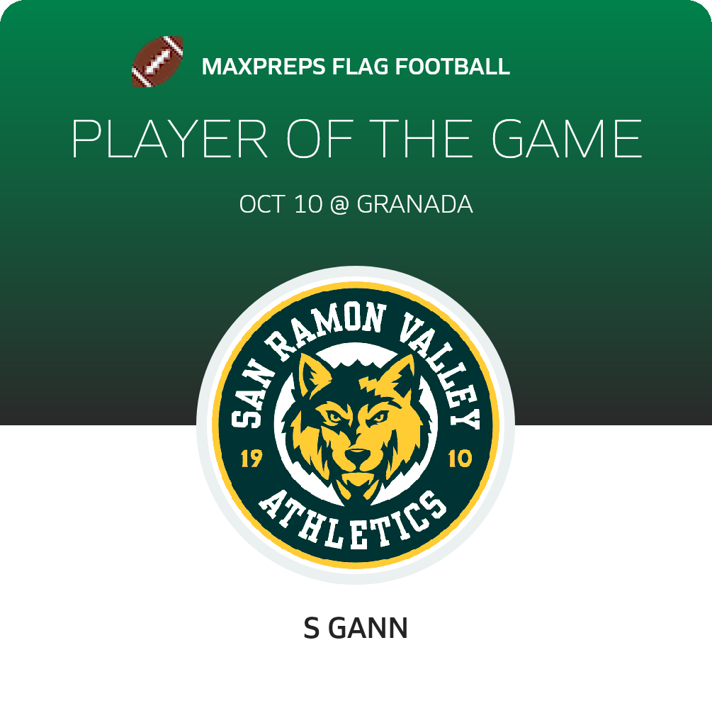 Congratulations to #22 S Gann for being selected the San Ramon Valley Girls Flag Football Player of the Game.