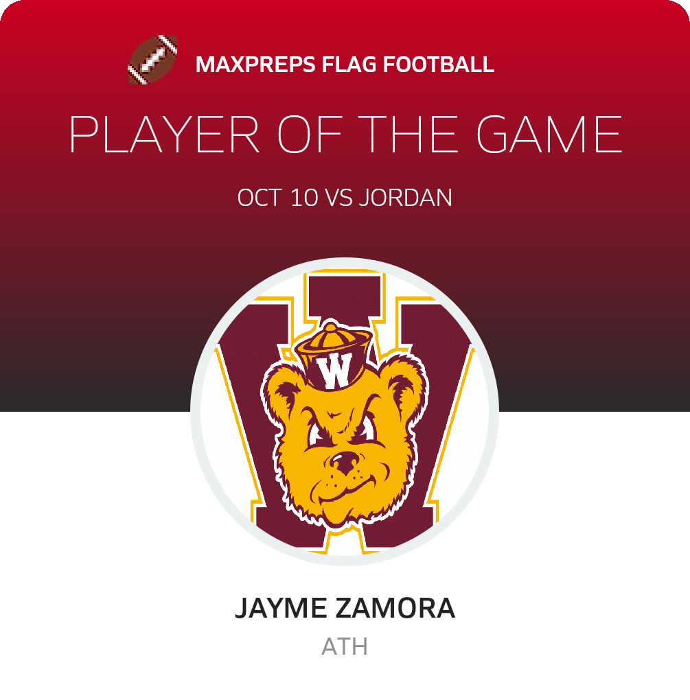 Congratulations to #22 Jayme Zamora for being selected the Woodrow Wilson Girls Flag Football Player of the Game.
