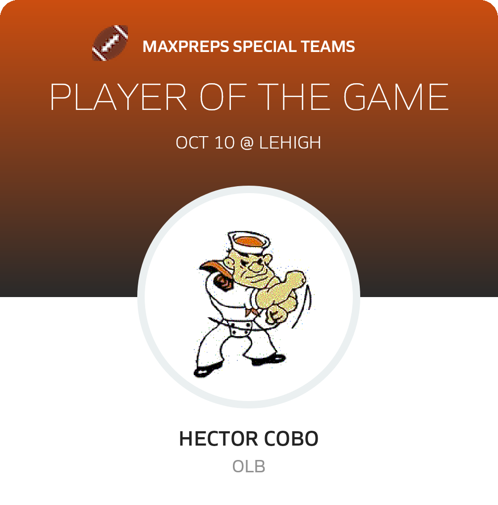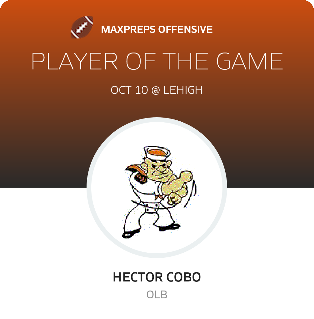 Congratulations to #60 Hector Cobo for being selected the Overall, Offensive, Defensive and Special Teams Sarasota Football Player of the Game.