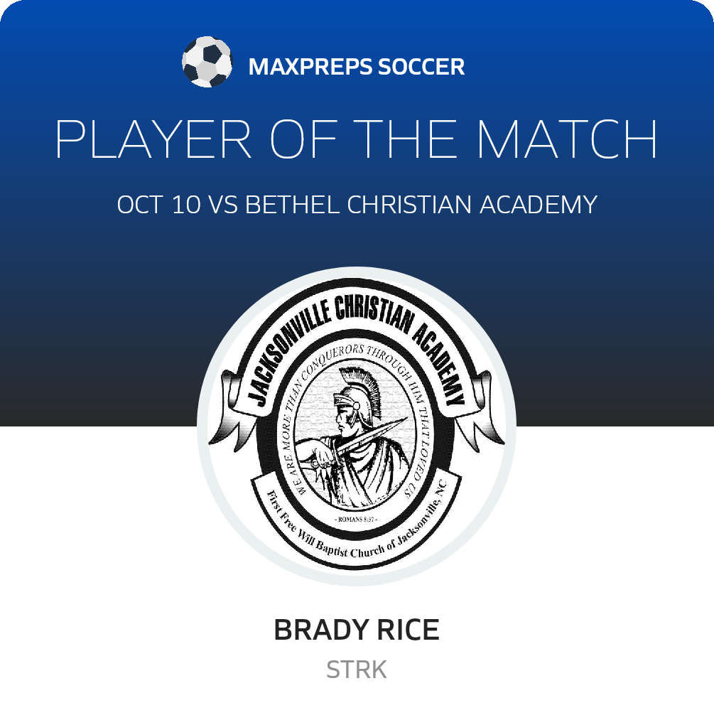 Congratulations to #9 Brady Rice for being selected the Jacksonville Christian Academy Soccer Player of the Match.
