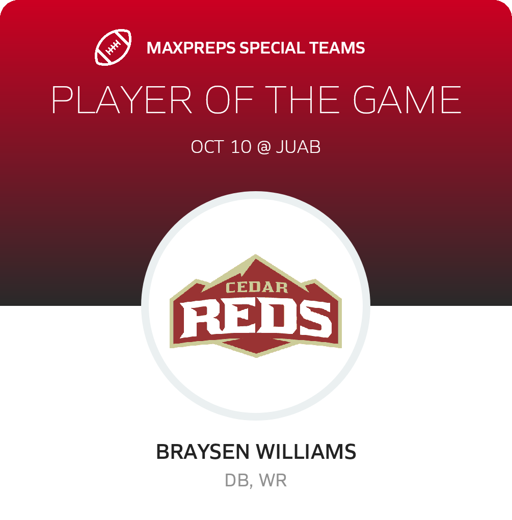 In their next game, the Reds face the Carbon Dinos (Price, UT) in a 3A - South game, on Thursday, October 16. Cedar will attempt to better on its 9-0 season record. The Dinos enter the game with a 2-7 record after their 42-21 league loss to Manti (Manti, UT).