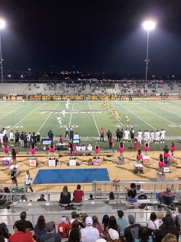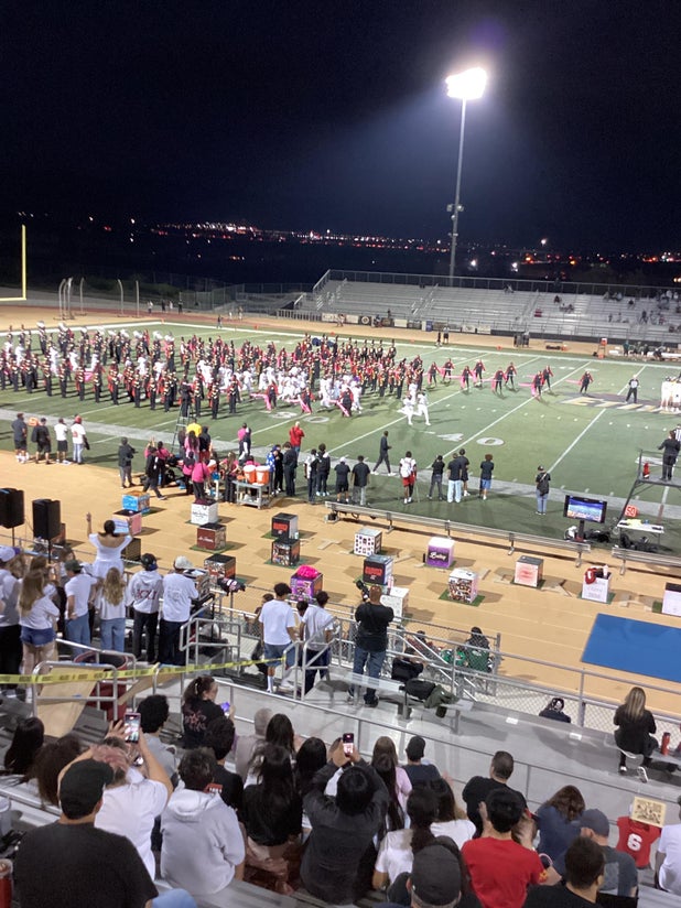 October 10, 2025: Etiwanda, CA 91739 Damien Spartans (La Verne, CA) boosters were content Friday as they observed their football squad thwart the host Etiwanda Eagles (Etiwanda, CA), 49-31 in a league match.