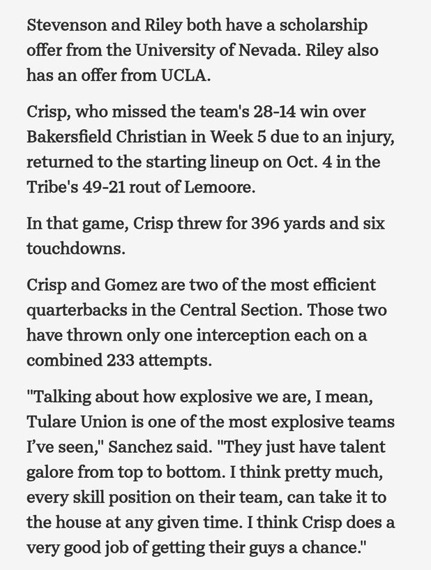 The The Tribe now own a 6-1 record. They play next when they host Mission Oak for a West Yosemite bout on Friday, October 18. Tulare Union will encounter a Hawks team coming off a 17-7 league loss to Lemoore (Lemoore, CA). The Hawks record now stands at 3-4.