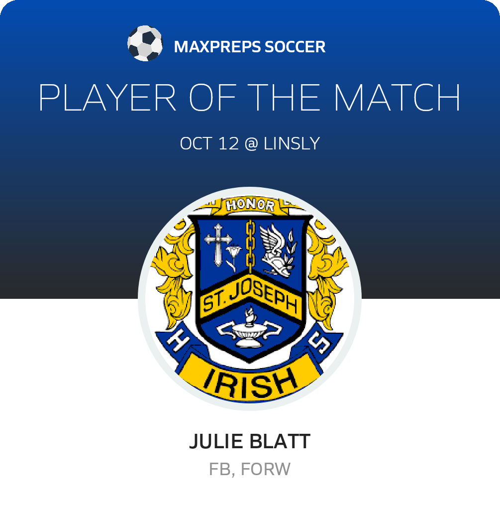 Congratulations to #15 Julie Blatt for being selected the St. Joseph Central Girls Soccer Player of the Match.