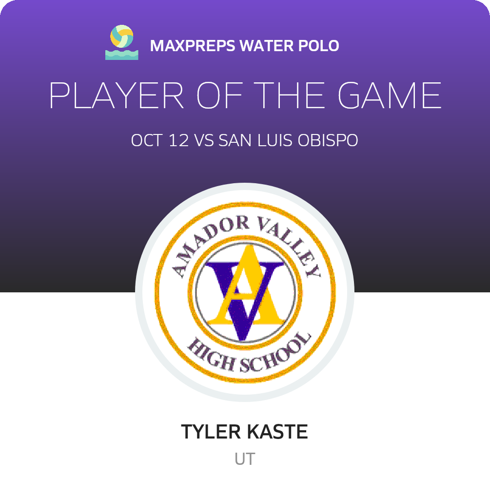Congratulations to #7 Tyler Kaste for being selected the Amador Valley Water Polo Player of the Game.