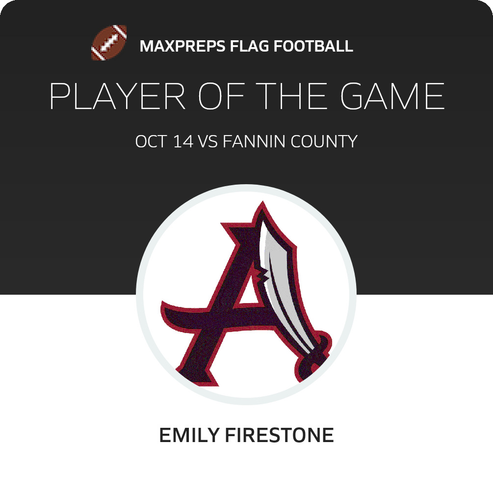 Congratulations to #17 Emily Firestone for being selected the Alpharetta Girls Flag Football Player of the Game.