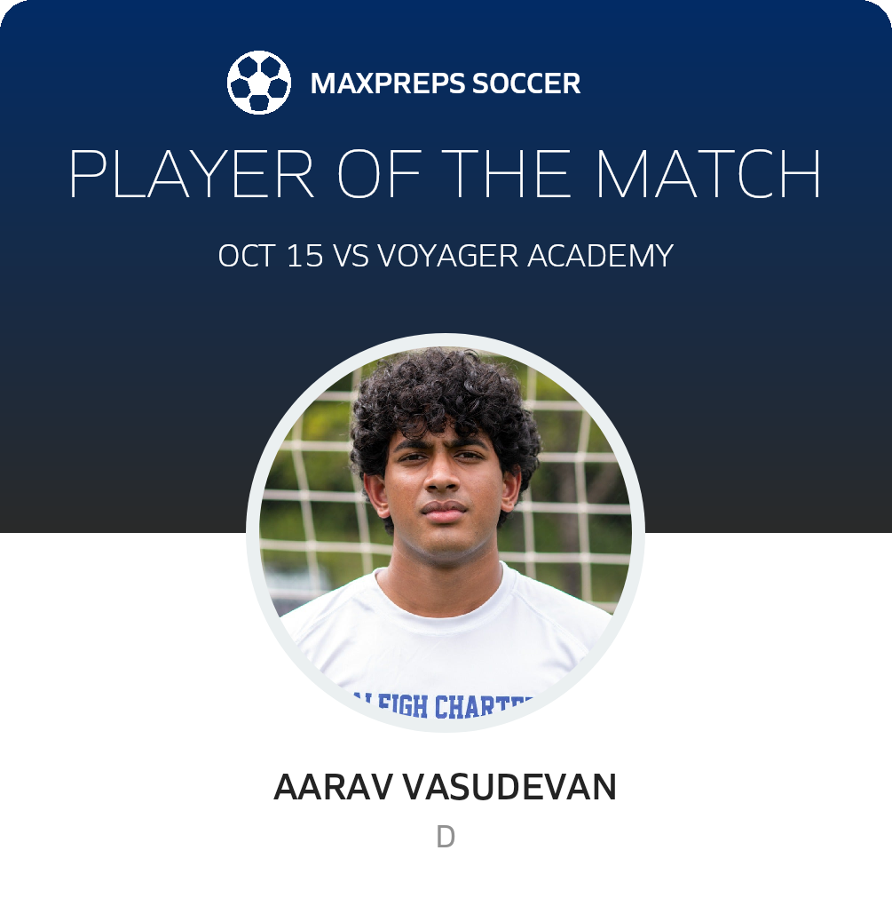 Congratulations to Aarav Vasudevan for being selected the Raleigh Charter Soccer Player of the Match.
