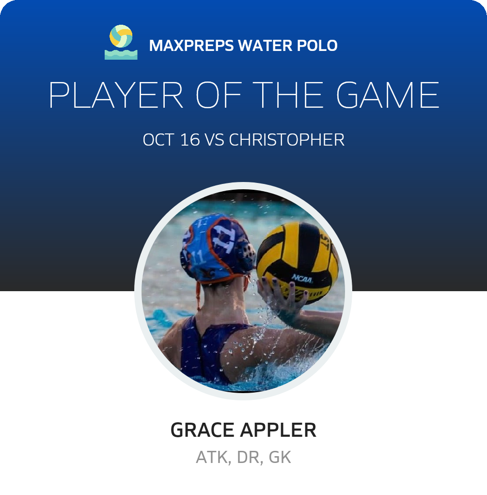 Congratulations to #11 Grace Appler for being selected the Santa Teresa Girls Water Polo Player of the Game.