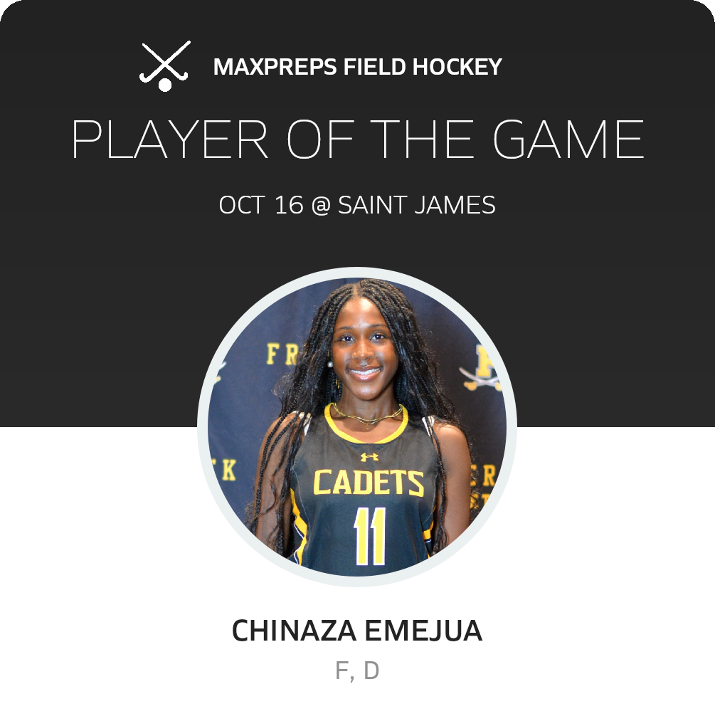 Congratulations to #11 Chinaza Emejua for being selected the Frederick Field Hockey Player of the Game.