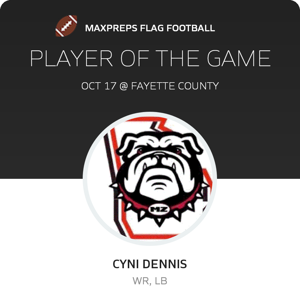 Congratulations to CYNI DENNIS for being selected the Mt. Zion Girls Flag Football Player of the Game.