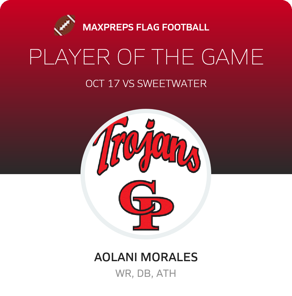 Congratulations to #15 AOLANI MORALES for being selected the Castle Park Girls Flag Football Player of the Game.