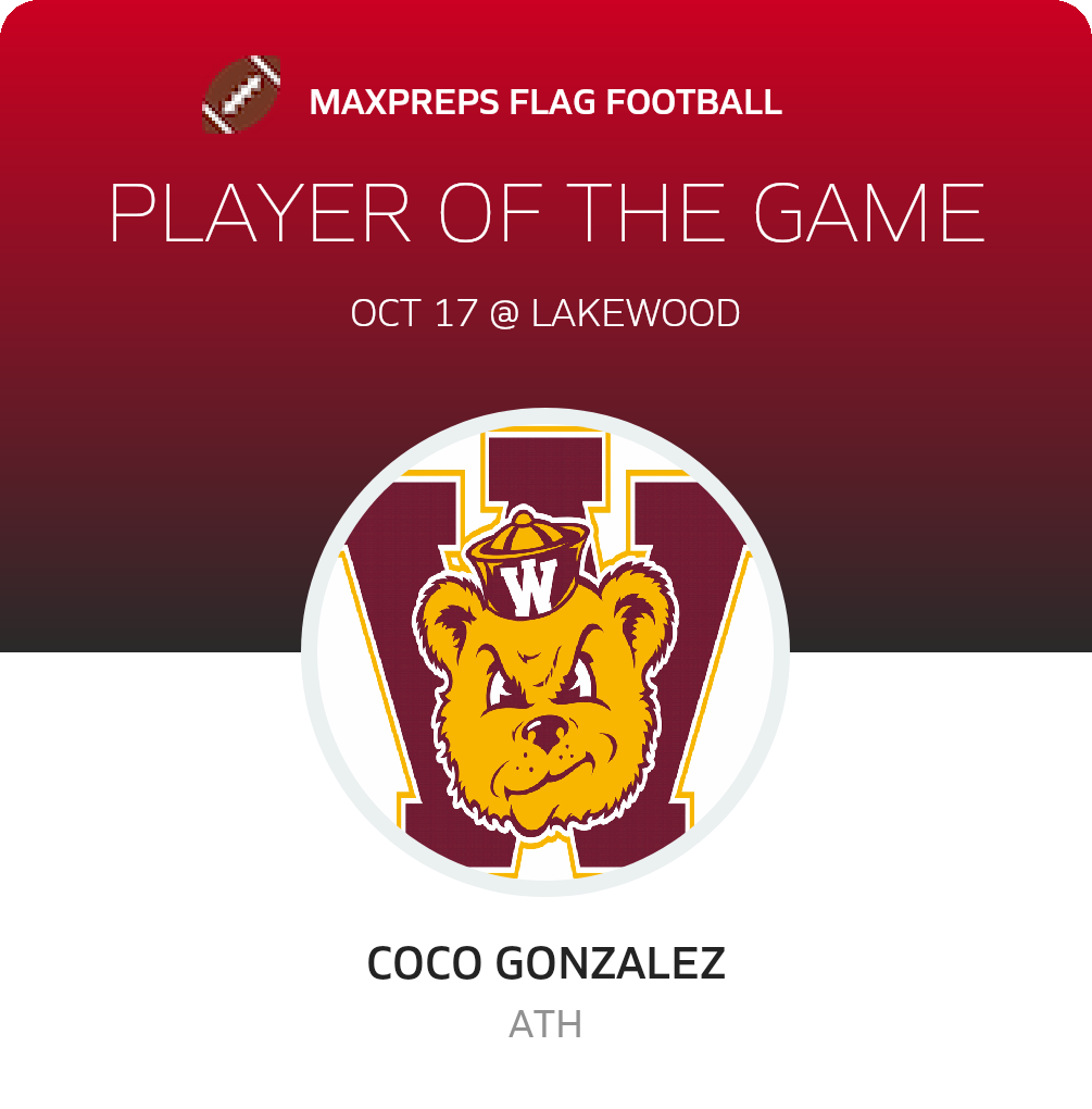 Congratulations to #18 Coco Gonzalez for being selected the Woodrow Wilson Girls Flag Football Player of the Game.