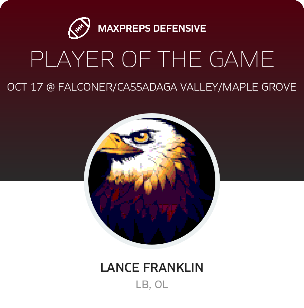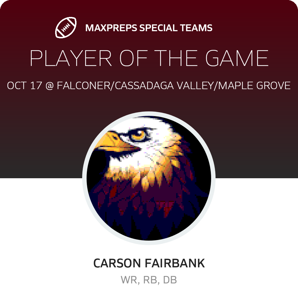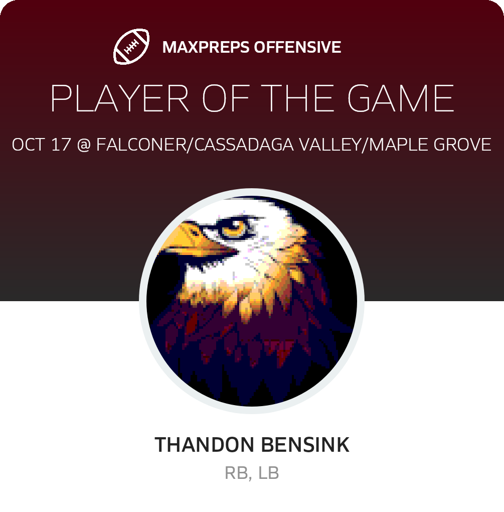 Congratulations to #2 Tristen Gibbs (overall), #12 Thandon Bensink (offensive), #53 Lance Franklin (defensive) and #4 Carson Fairbank (special teams) for being selected the Chautauqua Lake/Westfield/Brocton Football Players of the Game.