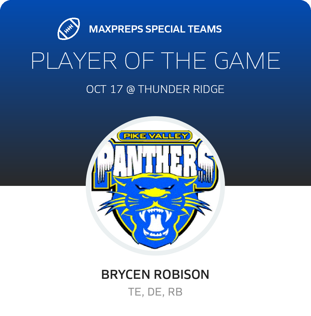 Congratulations to #10 Dayton Reeves (offensive), #43 Korey Cyr (defensive) and #14 Brycen Robison (special teams) for being selected the Pike Valley Football Players of the Game.