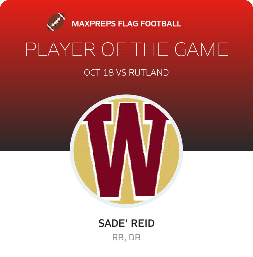 Congratulations to #5 Sade' Reid for being selected the Westside Girls Flag Football Player of the Game.