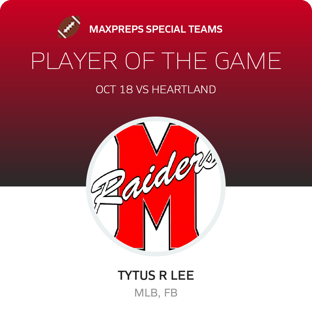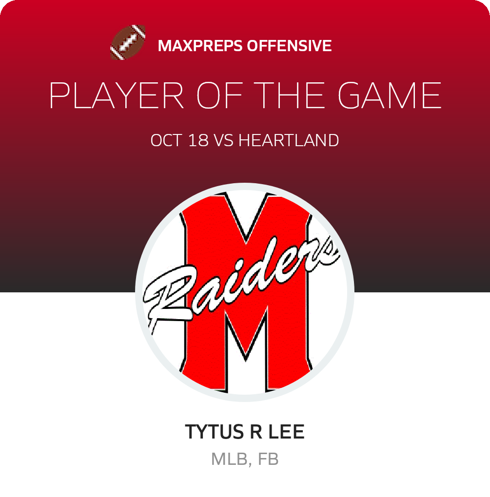 Congratulations to #23 Tytus R lee for being selected the Overall, Offensive, Defensive and Special Teams Mead Football Player of the Game.