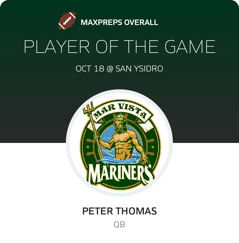 With the win, Mar Vista advances its record to 2-6 on the season. The Mariners travel to Southwest SD (San Diego, CA) to encounter the Raiders in a Metro - Pacific bout on Friday, October 25. The Raiders go into the bout with a record of 4-4. Southwest SD won 15-7 in their recent league bout against Castle Park (Chula Vista, CA)