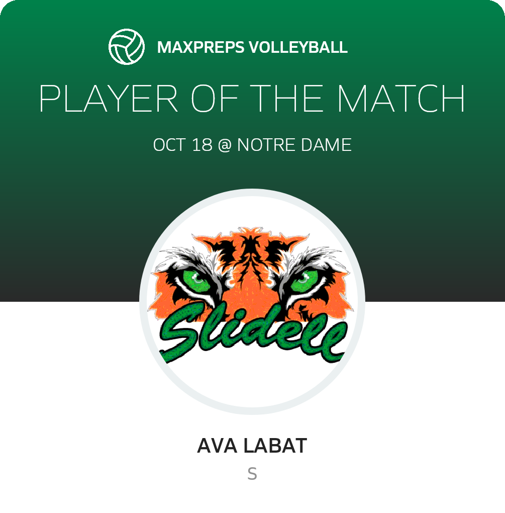 Congratulations to #11 Ava Labat for being selected the Slidell Volleyball Player of the Match.