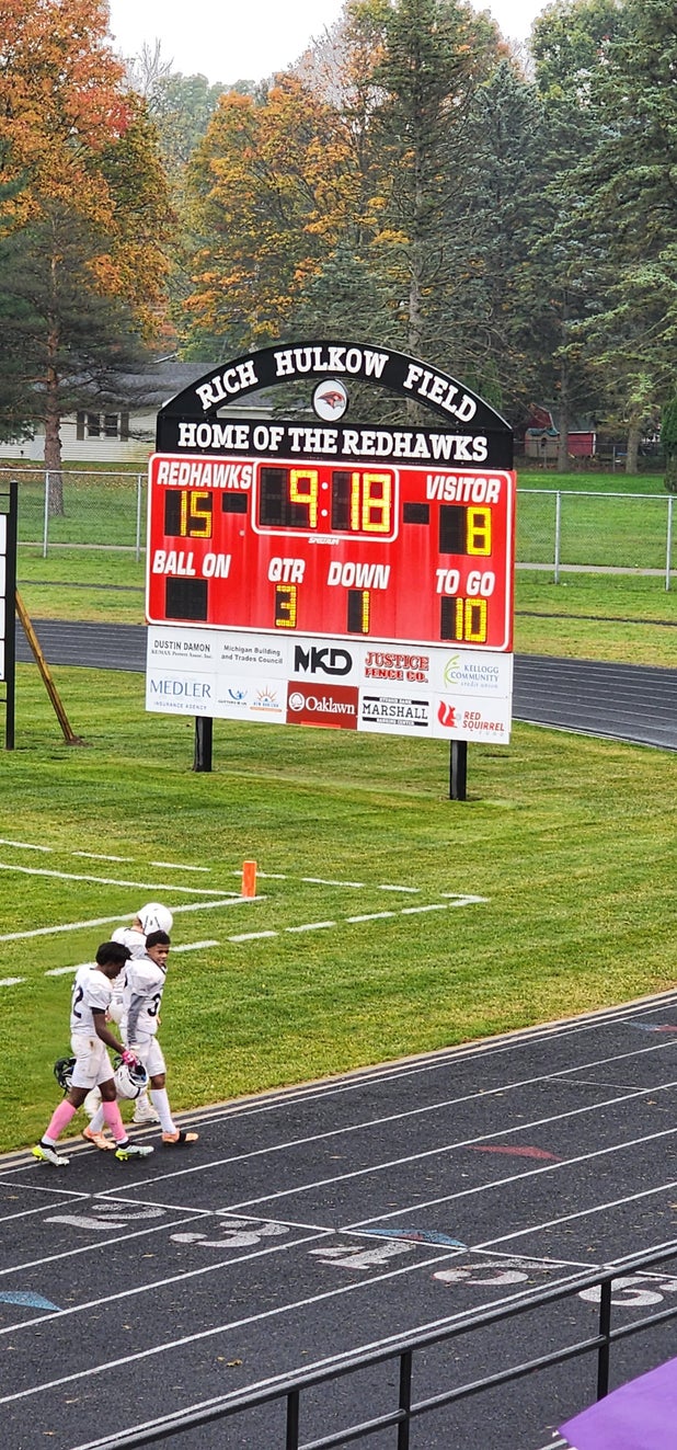 October 19, 2023: Marshall, MI 49068 The Marshall Redhawks thwarted the visiting Norrix Knights football team by a count of 28-8 in Thursday's non-league outing.