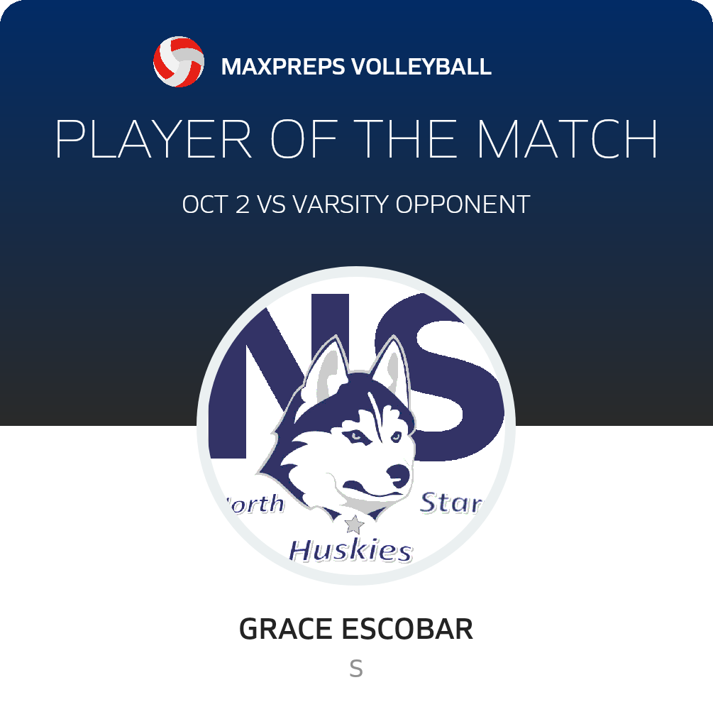 Congratulations to #10 Grace Escobar for being selected the North Star Volleyball Player of the Match.