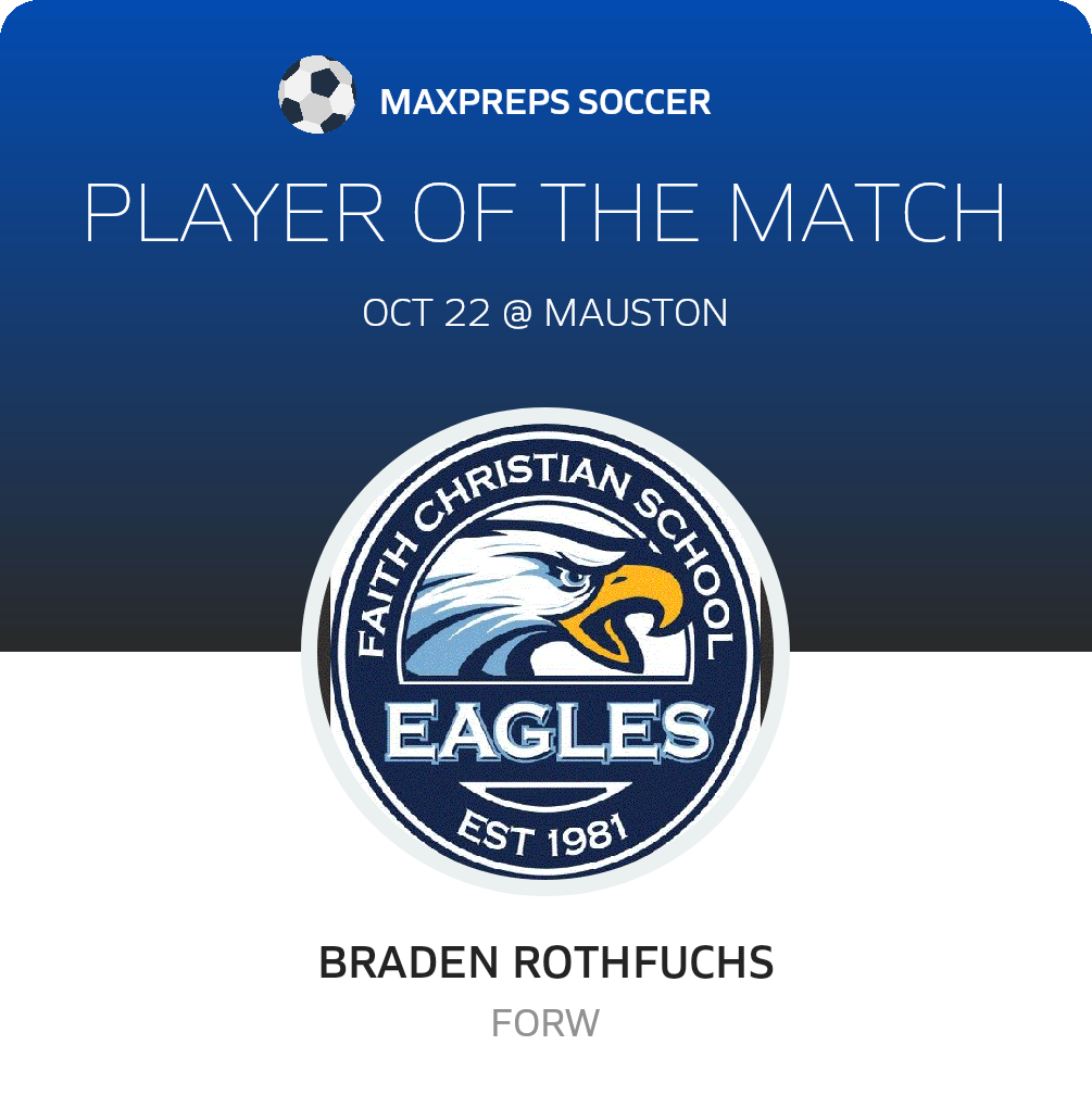 Congratulations to #16 Braden Rothfuchs for being selected the Faith Christian Soccer Player of the Match.
