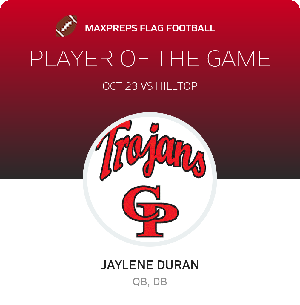 Congratulations to #27 JAYLENE DURAN for being selected the Castle Park Girls Flag Football Player of the Game.