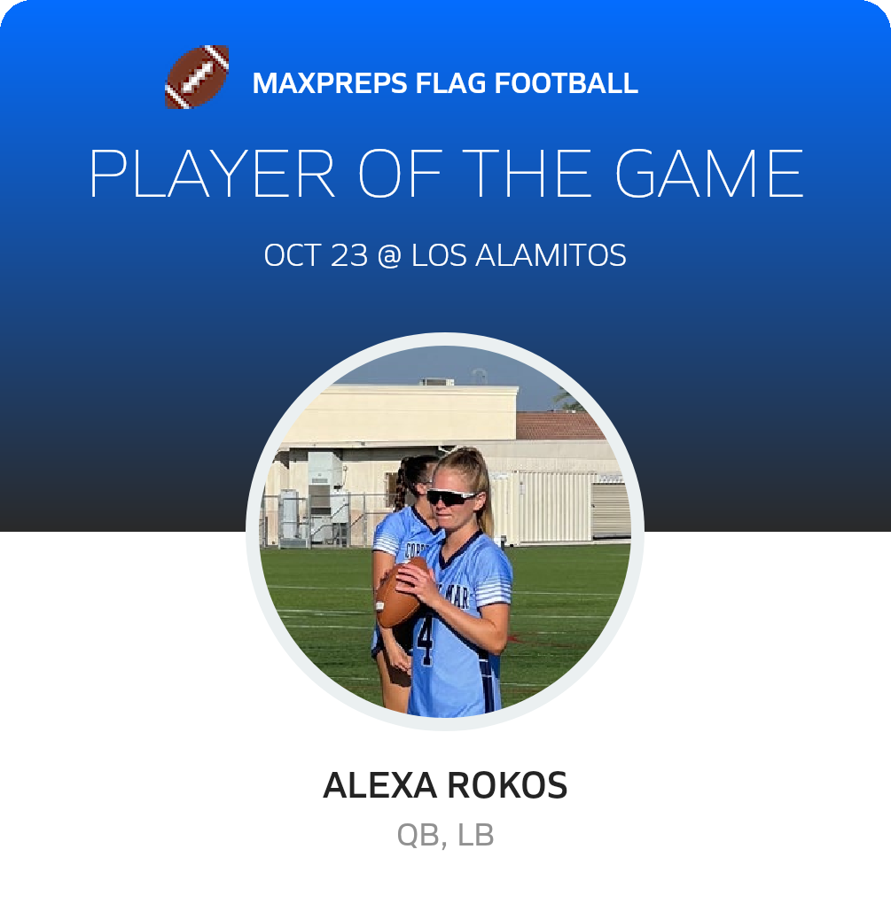 Congratulations to #4 Alexa Rokos for being selected the Corona del Mar Girls Flag Football Player of the Game.
