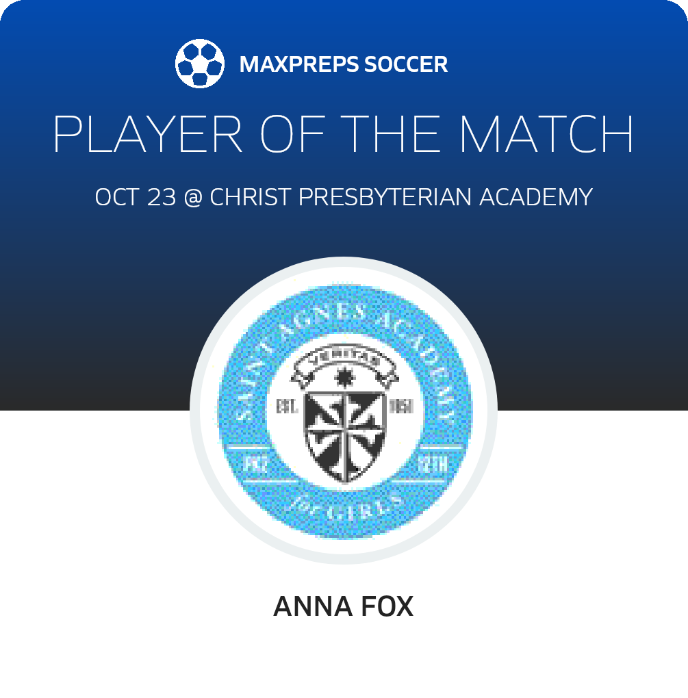 Congratulations to Anna Fox for being selected the St. Agnes Academy Girls Soccer Player of the Match.