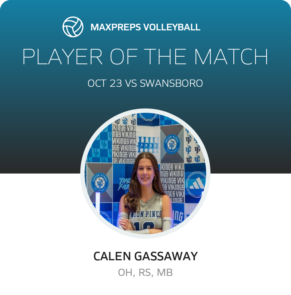 Congratulations to #10 Calen Gassaway for being selected the Union Pines Volleyball Player of the Match.