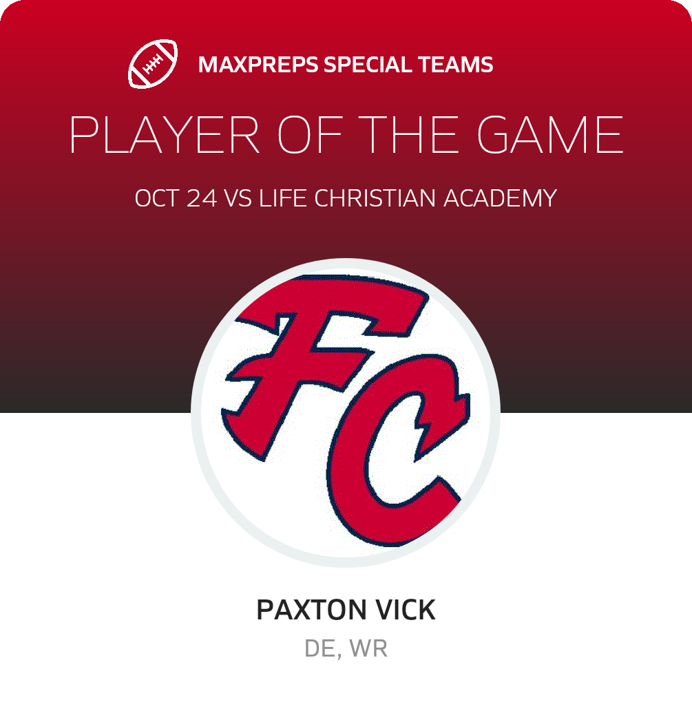 Congratulations to #3 Blayde Hinton (overall), #2 Vincent Wilson (offensive), #4 Ramsey Ward (defensive) and #9 Paxton Vick (special teams) for being selected the Faith Christian Football Players of the Game.
