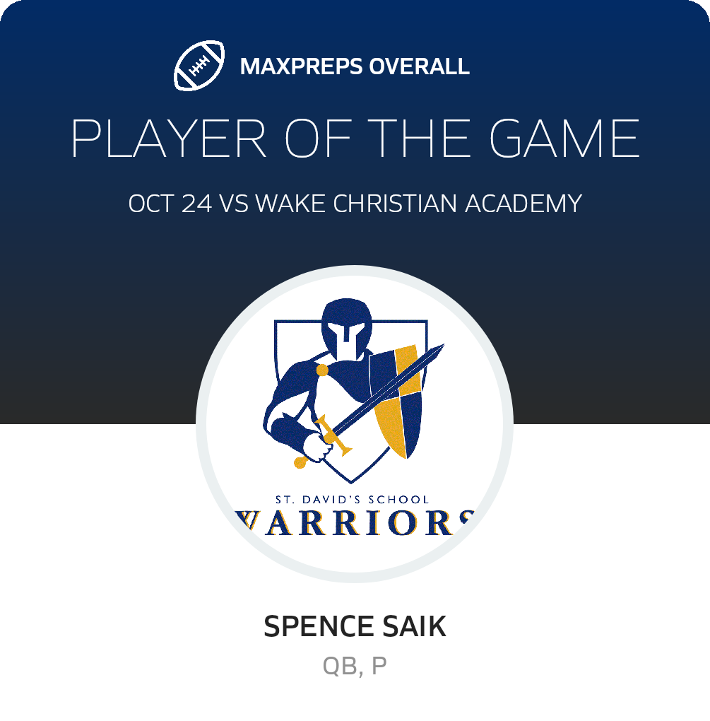 In their next game, the Warriors face the Cary Christian Knights (Cary, NC) in a NCISAA 8-Man Freelance (8 Man) game, on Friday, October 31. St. David's will attempt to better on its 4-5 season record. The Knights enter the game with a 8-1 record after their 52-38 league loss to Arendell Parrott Academy (Kinston, NC).