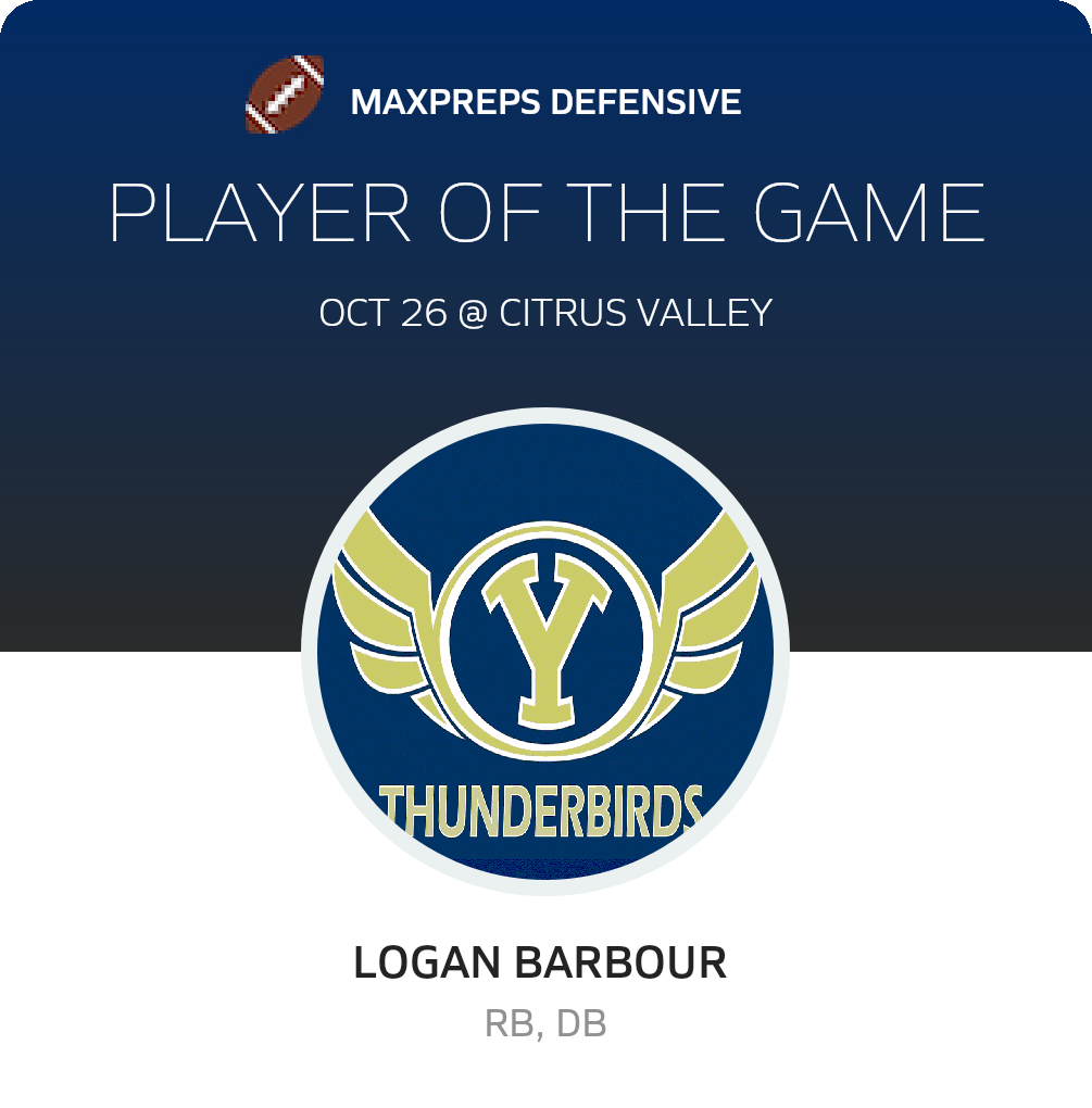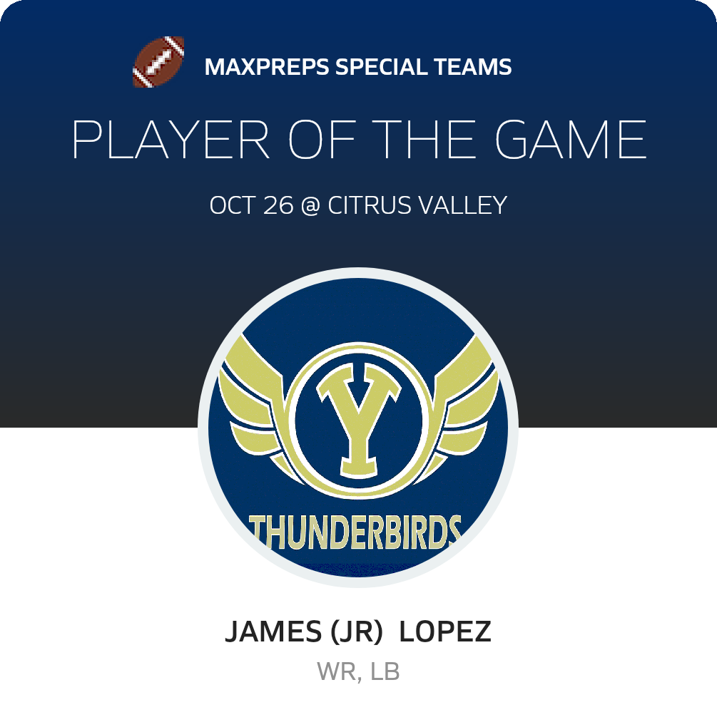 Congratulations to #55 Dean Kirkland (overall), #7 Kai Smith (offensive), #2 Logan Barbour (defensive) and #88 James (JR) Lopez (special teams) for being selected the Yucaipa Football Players of the Game.