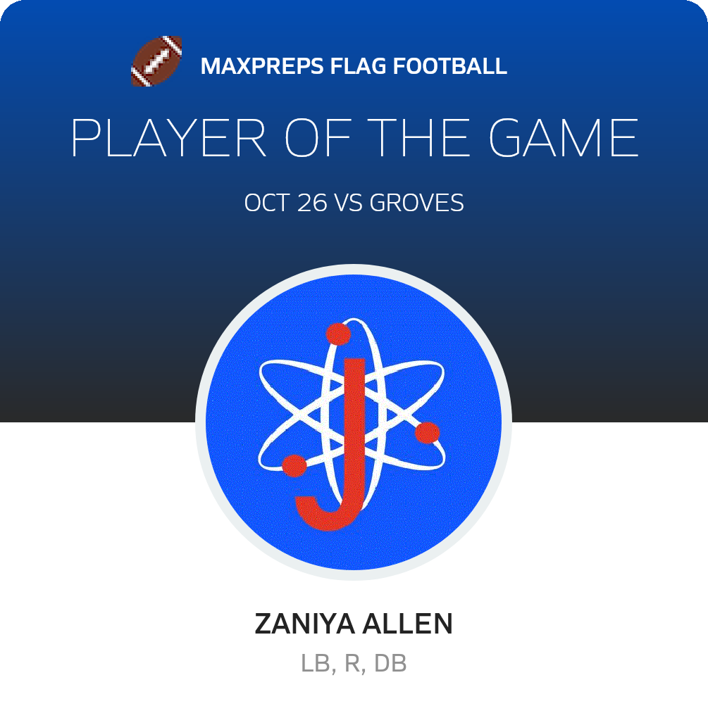 Congratulations to #12 Zaniya Allen for being selected the Johnson Girls Flag Football Player of the Game.